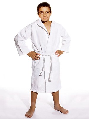 Pamper your kid's senses with our ultra sumptuous Hooded Waffle Weave Bathrobes. The soft texture of the deep diamond waffles is extremely lighweight, yet highly absorbent and fast drying. The 100 % Genuine & Eco-Friendly Turkish Cotton is exceptionally lavish and becomes even softer after the first wash. The side pockets provide extra comfort and convenience. The deep waffles would add utmost sophistication to your spa experience, ensuring that this elegant and upscale Hooded Bathrobe would relax your kid in the lap of extreme luxury every time he / she slips into it..../ Royal Resort Collection: Luxury Hooded Robe - Waffle Weave (Diamond Pattern) Kids Bathrobe, 100% Turkish Eco Cotton, Color: Pure White, Size: (7-11 yo), UNISEX / Kids Robe
